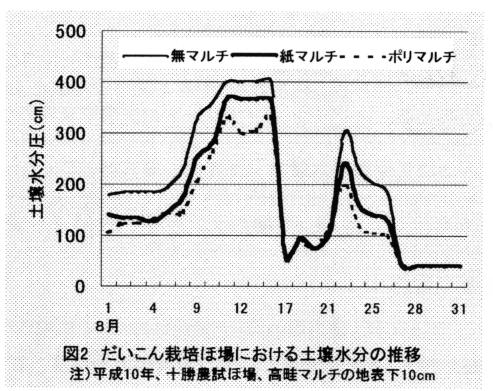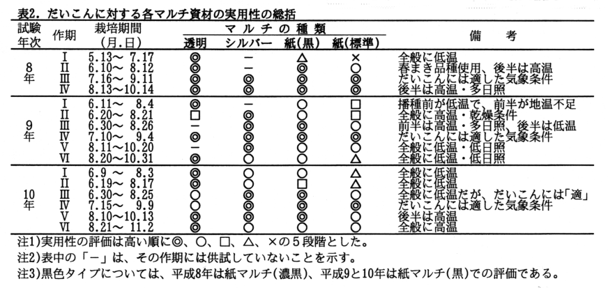 だいこん:栽培期間中の低地温が根形不良の大きな原因となるため、黒紙マルチのみ、7月上旬から8月上旬播種の作期においてシルバーマルチの代替として使用できる(表2)。