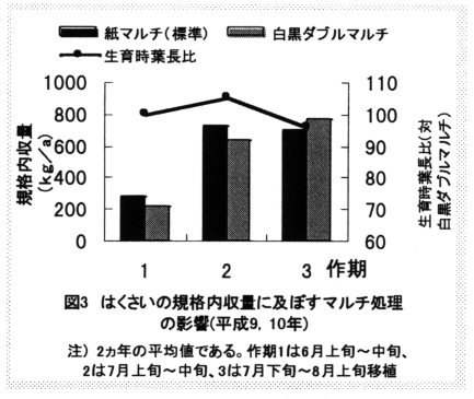 はくさい:6月上旬から8月上旬の移植作期における紙マルチの収穫期、規格内収量は白黒ダブルマルチとほぼ同等である。ただし、6月上旬から6月下旬の移植作期では、紙マルチの生育が、白黒ダブルマルチに比べてやや劣る場合がある(図3)。