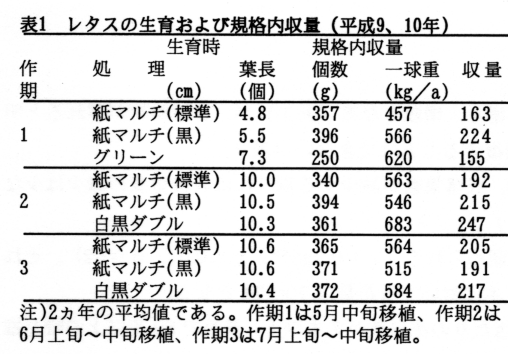レタス:紙マルチは、5月中旬移植作期では、グリーンマルチより生育は劣るが、規格内率は高い。6月上・中旬の移植作期では、白黒ダブルマルチに比べ生育はやや劣るが、規格内率はほぼ同等となる。7月上・中旬移植作期では、紙マルチの収穫期、規格内収量とも白黒ダブルマルチとほぼ同程度となる(表1)。