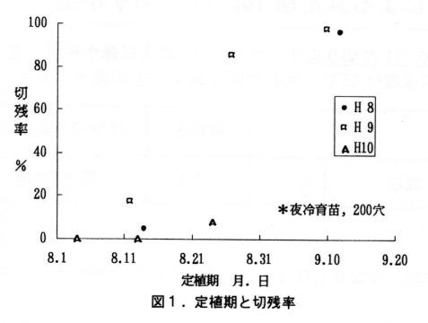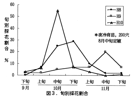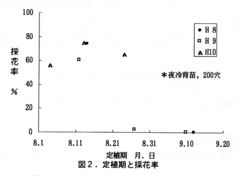 8月中旬定植の採花率が安定して高いが、9月上旬定植では切り残しが多く、ほとんど採花できない(図1)。8月下旬定植では年次により採花率が不安定である(図2)。