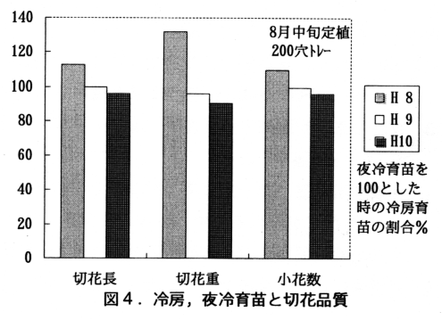 冷房および夜冷育苗の切花品質に与える差は年次間で変動があり、高温年では冷房育苗が優れていたが冷涼年では差は認められない(図4)。