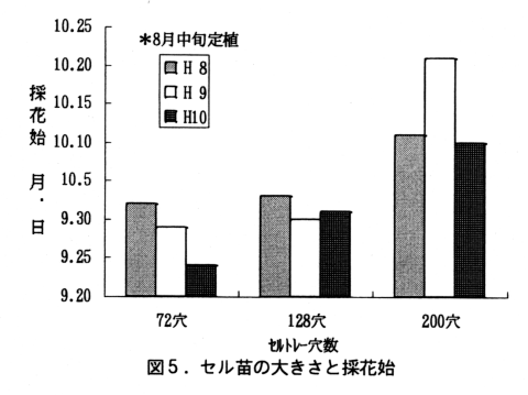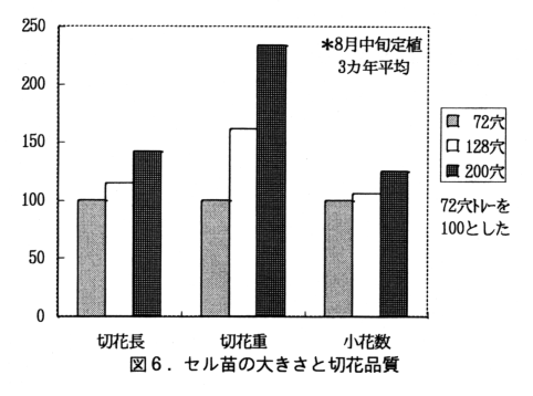 使用するセルトレーは穴数が多いものを使用し、小苗(200穴)で定植した方が切花品質が良好である(図5、図6)。