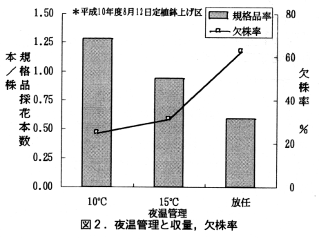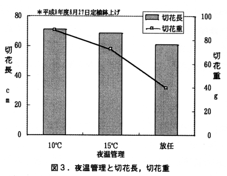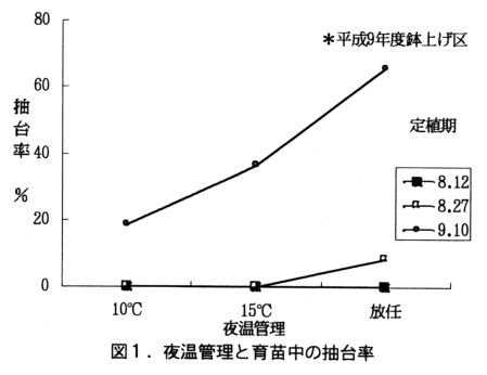 夜冷育苗の効果として育苗時の抽台抑制、定植後の早期抽台抑制、欠株率の低下、切花品質の向上が認められる。夜冷育苗の処理夜温は15℃が適当である(図1、図2、図3)。