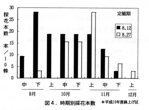 夜冷育苗苗利用による夏定植10、11月切り作型では、鉢上げ苗を利用し8月下旬までに定植する必要がある(図4)。