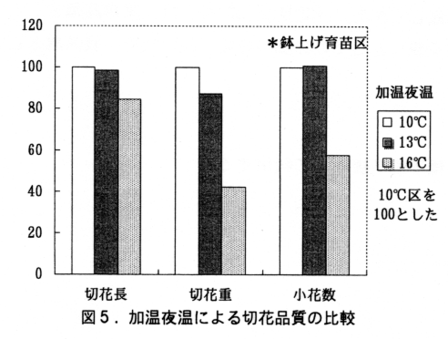 秋期加温夜温13℃と16℃では到花日数の差は少ないが、切花品質(切花長、切花重、小花数の増加)では13℃が優れるので、秋期加温夜温13℃が適当である(図5)。