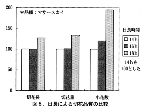 長日条件で開花促進、切花品質向上効果(切花長、切花重、小花数の増加)が認められる(図6)。