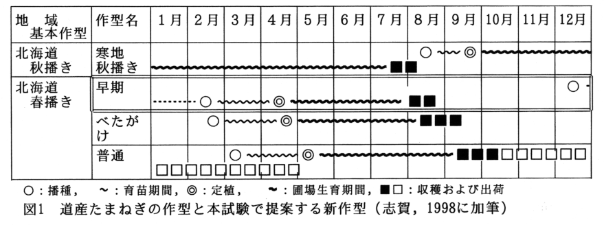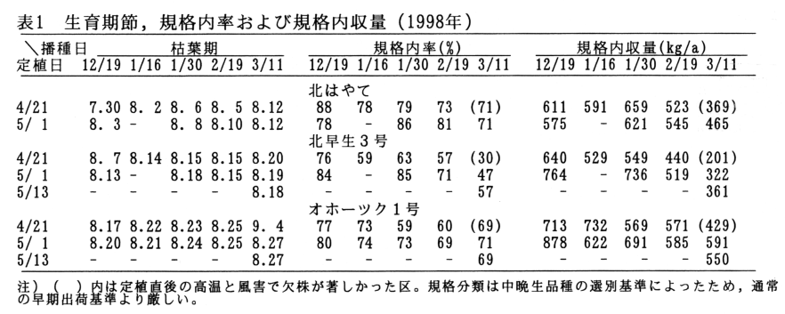 研究課題名:たまねぎ新品種育成試験 予算区分 :道単 研究期間 :平成10年度(平成9〜10年) 発表論文等:タマネギの長期越冬育苗法と早期定植による前進栽培技術(第1報)苗生育と収量および品質,北海道園芸研究談話会報,31,11-12,1998