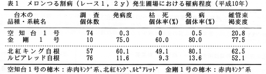 つる割病(レース1,2y)未発生圃場では穂木の両性花着生率・着果率は対照と差がなく、着果期までの草勢もほぼ同等である。しかし、着果以降の草勢が未発生圃場において対照よりやや劣る場合がある。