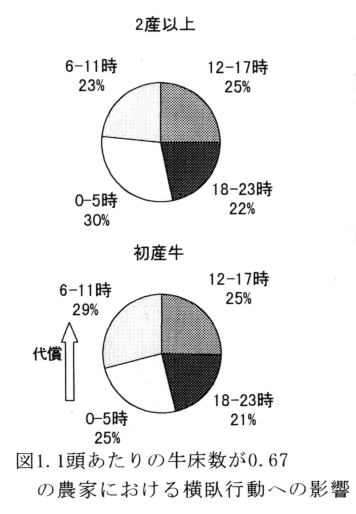 3.1頭あたりの牛床数が一番少ない農家において、全横臥時間に占める0〜5時の割合は初産牛が25%であり、2産以上の牛(30%)よりも少ないが、6〜11時の割合は初産牛で29%と2産以上の牛(23%)より多い傾向があり、初産牛は夜間の横臥の不足分を昼間に補っている(図1)。