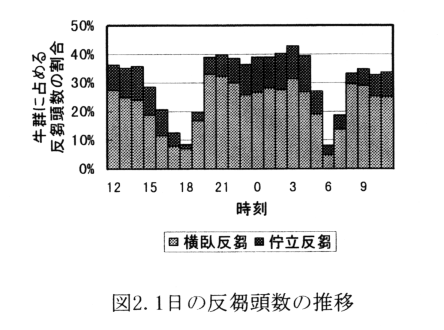 反芻行動の評価には、搾乳前後それぞれ約2時間を除いた、牛群に占める割合を用いる。