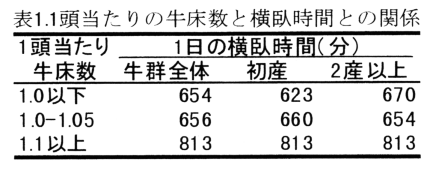 2.21頭当たりの牛床数が1.0以下の農家と1.1以上の農家の1日の平均横臥時間には有意差がなく、横臥時間は牛舎構造や敷き料の影響が大きい(表1)。