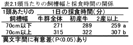 4.1頭当たりの飼槽幅が70cm以上の農家の2産以上の乳の1日の平均採食時間は307分であり、70cm以下(259分)よりも長い(表2)。