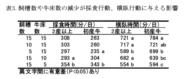 2.15頭に対して利用可能な飼槽数が5になると、2産以上の1日の採食時間は297分、初産牛の採食時間は235分となり、初産牛において飼槽数の減少による影響は大きい傾向がある。15頭に対して利用可能な牛床数が5になると、2産以上の1日の横臥時間は554分、初産牛の横臥時間は594分となったが、通路で横臥する初産牛が見られる(表3)。