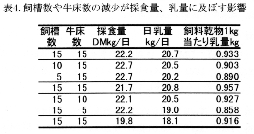3.飼槽数および牛床数の減少により、乳量がやや低下する傾向が見られたが、乾物摂取量への影響は見られず、飼養密度と生産性の関連については今後検討が必要である(表4)。