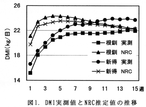 分娩後11〜15週のDMIは、根釧、新得各々21.7、23.8kg/日、DMI/体重は3.37、3.76%であり(表2)、泌乳安定期のDMI推定式は日本およびNRC飼養標準で採用されている体重およびFCMを独立変数として、次のように作成している。