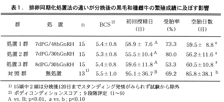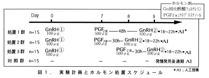 分娩後4〜10週の黒毛和種雌牛に、GnRHを注射した後7日目にPGF2αを投与し、その30〜48時間後に2回目のGnRHを投与して排卵同期化をはかり、処置終了後18〜22時間の間に授精するという定時人工授精技術によって、発情看視をすることなく従来の発情発見後の適期授精に匹敵する受胎率が得られ、かつ、空胎日数の短縮も可能であることが示された。