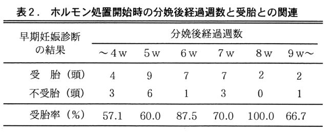 処置1、2および3群の牛について、分娩からホルモン処置を開始するまでの経過日数と受胎率との関係を調べたところ、分娩後4週から10週の間では大きな差はなかった(表2)。