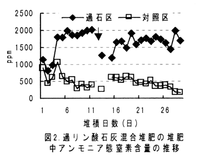 糞尿敷料混合物に過リン酸石灰を原物比で2.5%程度を混合して堆肥化することでアンモニアの揮散が抑制されるとともに、堆肥中のアンモニア態窒素含量が高く維持され、硝酸態窒素の生成が抑制された。(図1、2)
