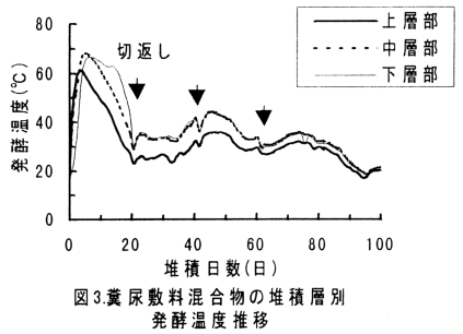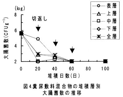 牛糞中の大腸菌は発酵によって、55℃以上の温度が10日間持続した場合で死滅した。切返しによってあらゆる部分が高温に曝されることが必須である。(図3、図4)