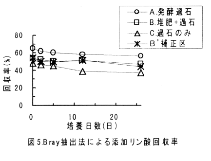 過リン酸石灰を堆肥化することにより、過リン酸石灰を直接施用した場合に比べて土壌中でのリン酸固定は抑制される可能性が示された。(図5)