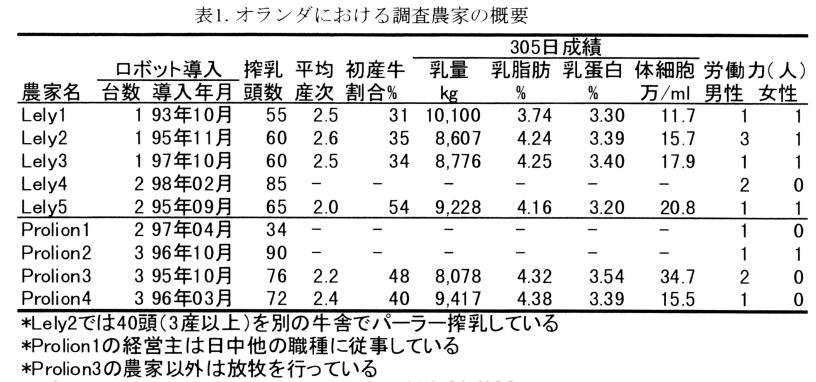 平成10年7月4日〜7月19日(16日間)にオランダ国内の搾乳ロボット導入農家9戸、研究機関2カ所において搾乳ロボットの利用状況、牛舎レイアウト、乳生産量等の調査を行った。
