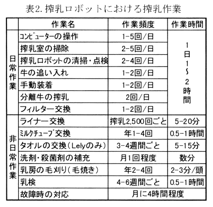 搾乳ロボット導入によって1日の搾乳作業に係わる時間は1〜2時間となり、内容はコンピューター操作や自動搾乳できなかった牛の対応、メンテナンス作業に代わる(表2)。