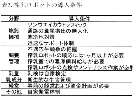 オランダおよび国内における搾乳ロボットの利用実態の調査を基に、国内における搾乳ロボット導入条件や導入時の問題点を整理する。