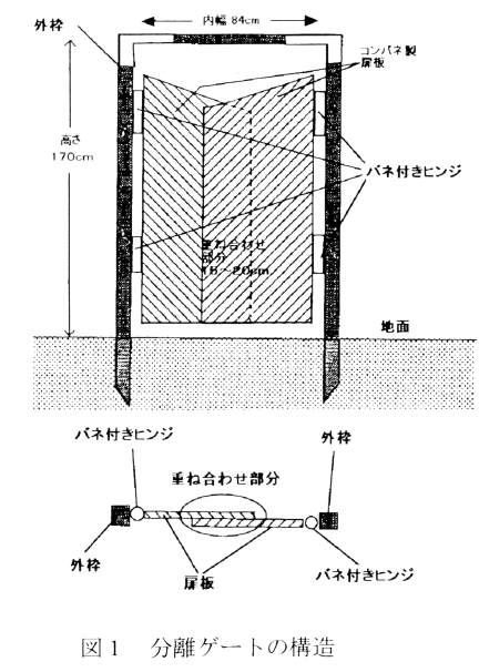 2枚のコンパネを重ね合わせて柱にスプリング付きの自由蝶番で固定して、前後に開くようにした扉(図1、写真)で、親牛は、馴致することによって扉を押して通過できる。朝夕、分離ゲートのロック(例えば電気を通したリボンワイヤー)を開けてやると親牧区にいた親牛は扉を押し開けて共同区に入り、子牛に哺乳をする。20〜30分経って親牛が授乳を十分した頃、親区に少量の餌を与えると、親は再びゲートを通って親区に移動する。親について行こうとする子牛はバタンという扉が閉じる音に驚いて、通過しない(図2)。材料費はおよそ2万円である。
