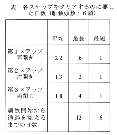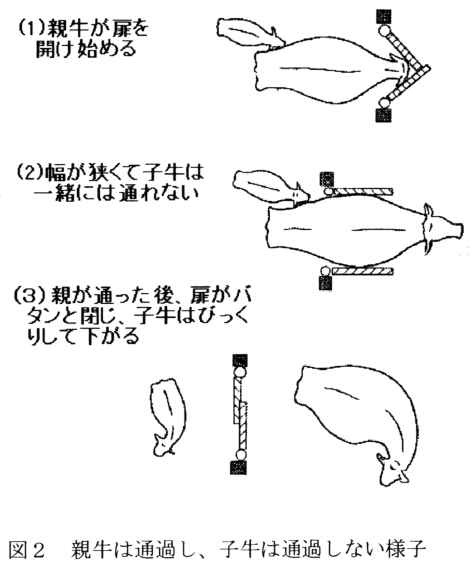 子牛を親牛の馴致時に一緒にしておくと覚えて、扉を押して通過するようになった例が5例のうち1例あった。子牛を馴致しなければほぼ100%通過しない。