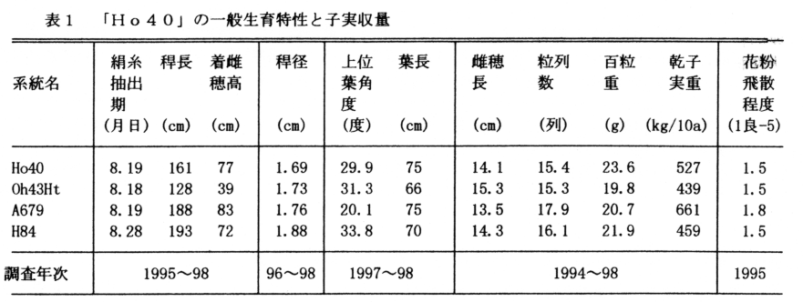 組合せ能力:「Ho40」とフリント種自殖系統「To90」(十勝農試育成)及び「Ho49」(北農試育成)との間の単交配F1系統「月交577」(北農試育成)及び「月交579」(北農試育成)の乾物収量、TDN収量は市販の北海道優良品種より勝っており、組合せ能力が優れる(表3)。