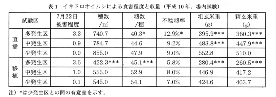 研究課題名:水稲直播栽培における病害虫の発生 予算区分 :道費 研究期間 :平成10年度(平成5〜10年) 発表論文等:北海道の水稲直播栽培における主要害虫の発生,北日本病害虫研究会報,48号,221,1997