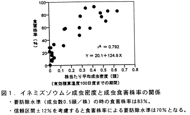 イネミズゾウムシ成虫密度の調査適期は積算温度(13.8℃以上)で70〜100日度の期間である。調査株数50株で食害株率70%に達するか否かで防除要否を判定する。また、アカヒゲホソミドリメクラガメは、好適植物の多い場所で固定して調査する。水田内では任意の場所でよい。