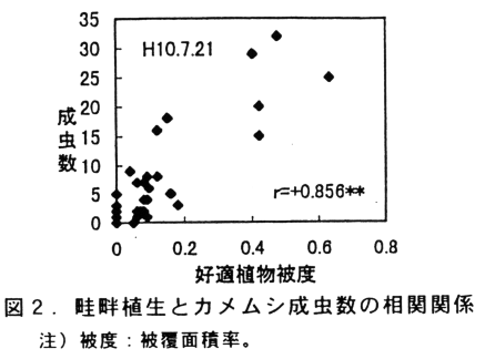 畦畔・農道等では、カメムシは好適植物(スズメノカタビラ等)の多いところに多い(図2)ので、発生モニタリング調査(捕虫網すくい取り)は、好適植物の多いところを選び、場所を固定して行うのが良い。