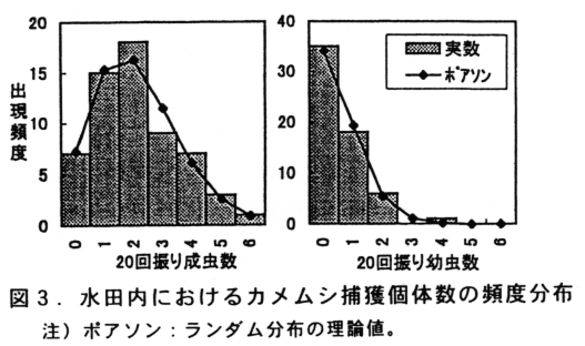 水田内では、カメムシはランダムに存在する(図3)ので、発生モニタリング調査(捕虫網すくい取り)は、任意の場所を選んで行えば良い。