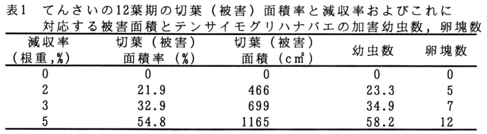 移植栽培てんさいの切葉による被害解析では、根中糖分に差は認められず、影響は根重にあらわれた。