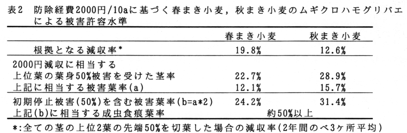 6月下旬に調査し、春まき小麦では、上位2葉について葉面積の約1/2に被害を受けた被害葉率が12%、秋まき小麦では同じく16%を上回る場合には防除を実施する(表2)。