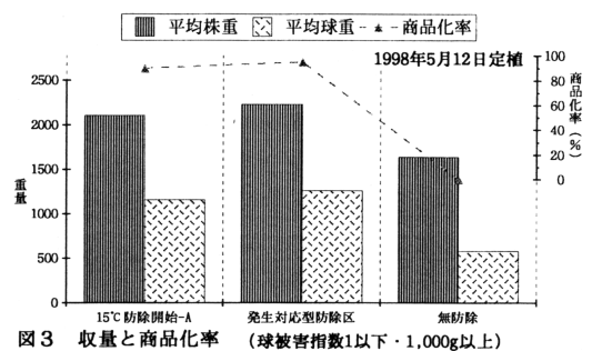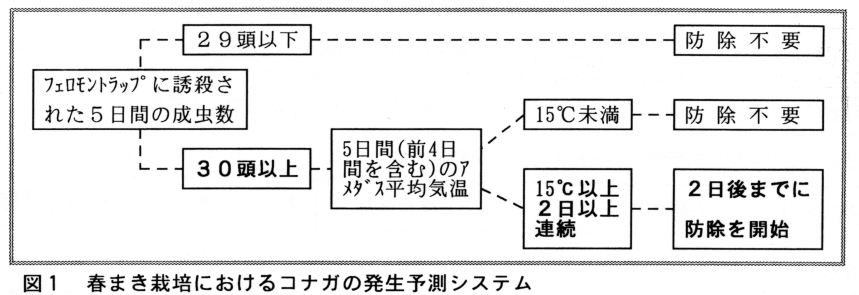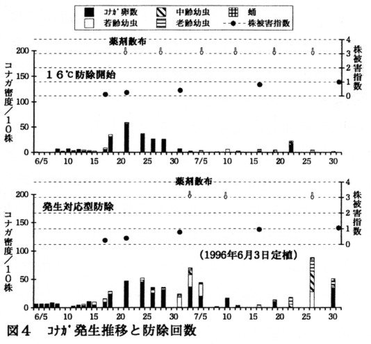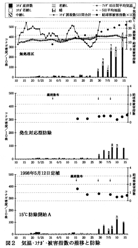 研究課題名:野菜害虫発生予測システムの開発 予算区分 :道費 研究期間 :平成10年度(平成8〜10年) 発表論文等:北海道のキャベツ圃場におけるコナガの産卵時期と幼虫加害時期,北日本病害虫研究会報,48号,229,1997,橋本庸三