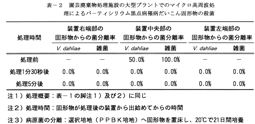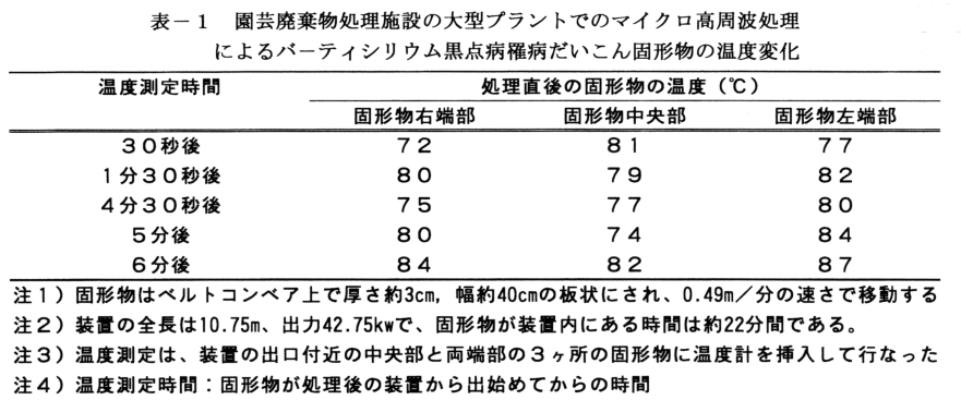 園芸廃棄物処理施設の大型プラントにおいて、パーティシリウム黒点病罹病だいこんを破砕・搾汁した後の固形物をマイクロ高周波処理することにより、固形物の温度は70℃以上に達し(表-1)、固形物中の病原菌を完全に殺菌できる(表-2)。