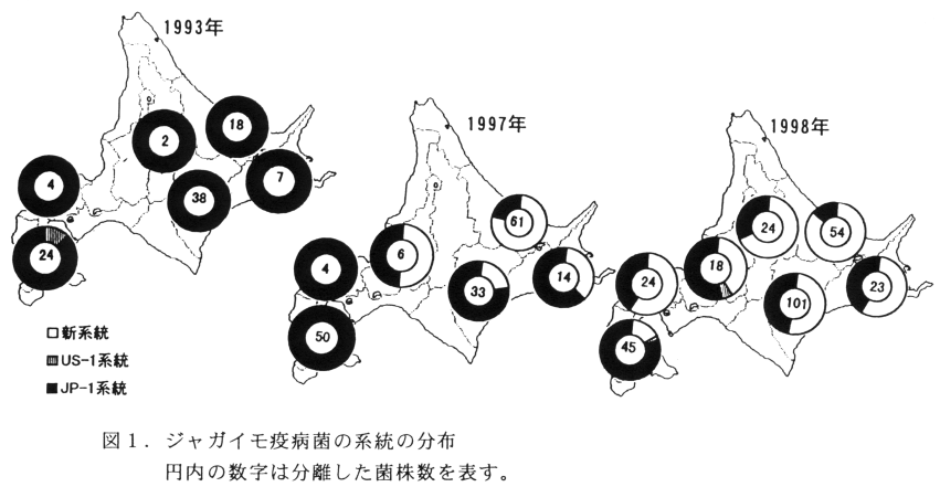 1996年に北海道網走地方で交配型A1の菌株が分離され、諸性質を調べることによってUS-1系統とは異なる新系統であることが確認された。その後新系統の分布域はしだいに拡大し、1997年には道央地方と道東地方で、1998年には北海道全域で分離された(図1)。新系統が分離される割合は道南地方で低かった。また、新系統は九州からも分離された。