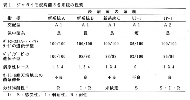US-1系統と新系統との間で異なる性質は、塊茎スライス上の気中菌糸の長さ、グルコースホスヘート・イソメラーゼおよびペプチダーゼ遺伝子型、病原性レース、メタラキシル耐性である。一方、JP-1系統と新系統との間で異なる点は、交配型とペプチダーゼの遺伝子型であり、新系統Aや新系統Cとはさらにオートミール培地上の菌糸生育の点で異なる(表1)。