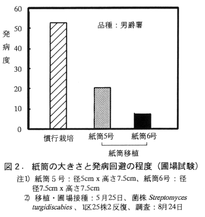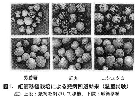 研究課題名:ジャガイモそうか病の抵抗品種利用法の解明 予算区分 :経常 研究期間 :平成10年度(平成10〜12年) 発表論文等:ジャガイモの移植栽培によるそうか病回避の可能性,日本植物病理学会報,64,p.580,1998