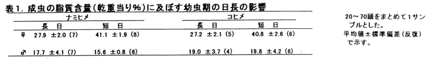 研究課題名:アブラムシに対する生物的制御因子としてのヒメハナカメムシの評価 予算区分 :経常 研究期間 :平成10年度(平成6〜10年) 発表論文等:Effect of photoperiod and reproductive diapause in the predatory bugs, Orius sauteri and O. minutus (Heteroptera: Anthocoridae). Appl. Entomol. Zool.,33(1):115-120, (1998)