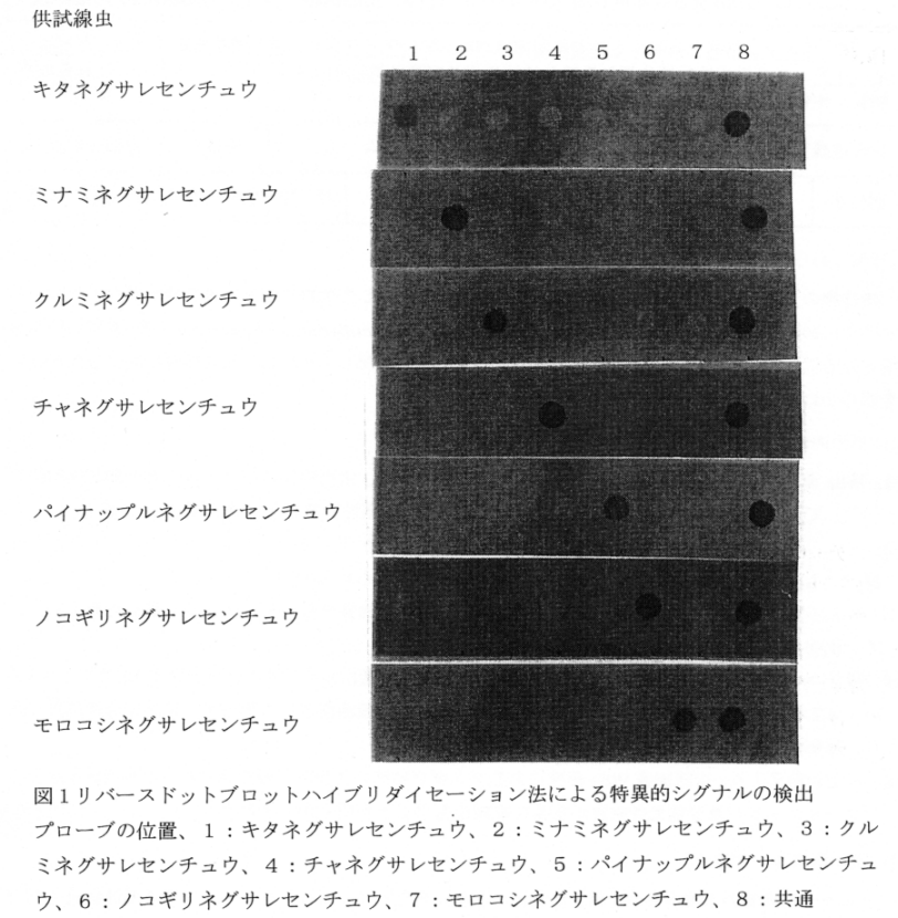 研究課題名:ネグサレセンチュウ類の種間・種内における生化学的特性の解明 予算区分 :経常 研究期間 :平成10年度(平成8〜11年度) 発表論文等:リバースドットブロットハイブリダイゼーション法を用いたネグサレセンチュウの同定,日本線虫学会第6回大会講演要旨