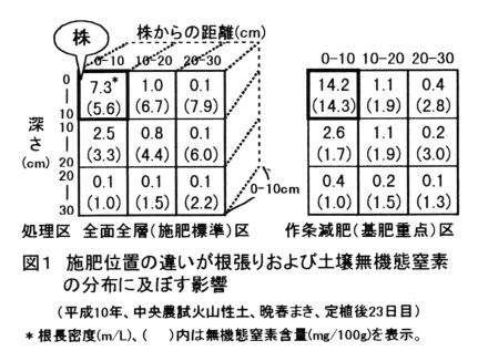 作条施用減肥系列では、根が最も密に分布している近傍に十分な窒素が存在し(図1)、窒素の供給と吸収が円滑に行われる。なお、作条施用にあたり、幅20cm程度に条施し、根鉢との間に3cm程度の間土をする。