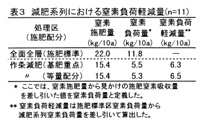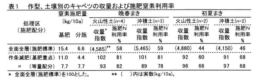 窒素3割減肥を行う場合の望ましい施肥法は、火山性土、沖積土を通じて、晩春まき栽培では作条施用−基肥重点、初夏まき栽培では作条施用−等量配分である(表1)。これらの施肥法により、従来の施肥法の全面全層−施肥標準に比べてほぼ同等の収量が確保できる。