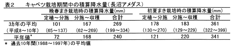 初夏まき栽培では降雨の多い時期に遭遇することから(表2)、基肥で施用した窒素の溶脱が晩春まき栽培に比べて多くなり、基肥重点では窒素が不足する。そのため、初夏まき栽培では、結球始期の分施窒素量を多くした等量配分の方が収量確保の上で望ましい施肥配分となる。
