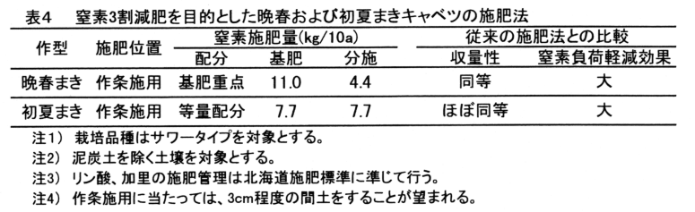 窒素3割減肥を目的とした晩春および初夏まきキャベツの窒素施肥法の特徴を表4に示す。