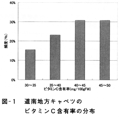 農家におけるキャベツのビタミンC含有率は34〜47mg/100gFWの範囲に分布し、平均は42mg/100gFWであり、四訂日本食品標準成分表の平均値(44mg/100gFW)よりやや低い(図-1)。また、窒素施肥量は14〜73kg/10aの範囲で、平均は30kg/10aである。栽植密度は10a当たり3859〜7407株の範囲で、平均は4937株/10aである。