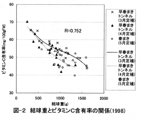 早春〜晩春まきの作型において、ビタミンC含有率は結球重が大きくなるにつれて低下し、また遅い作型ほどビタミンC含有率は低下する傾向を示す(図-2)。