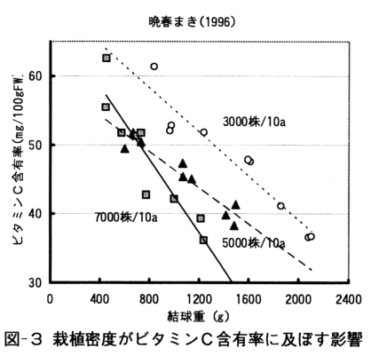 栽植密度が疎になるほど結球重が増加するが、結球重の増加にともなうビタミンC含有率の低下程度は小さい。また、結球重が同程度の場合、疎植ほど結球部のビタミンC含有率は高い(図-3)。